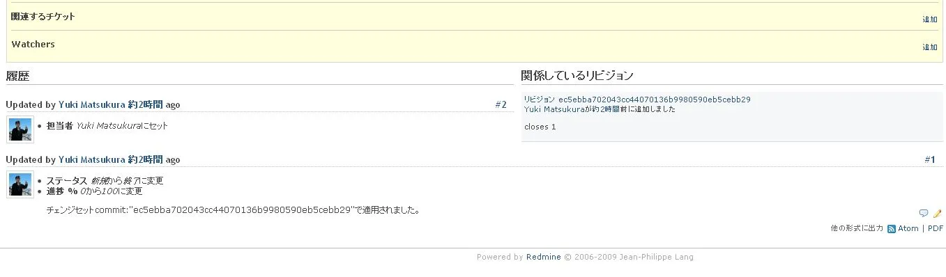 ■2 自動的にタスクを終了にする このプロジェクトでは、redmineが共有レポジトリのmasterを監視しています。 共有レポジトリのマスタに反映された時点でタスクが終了に設定されます。