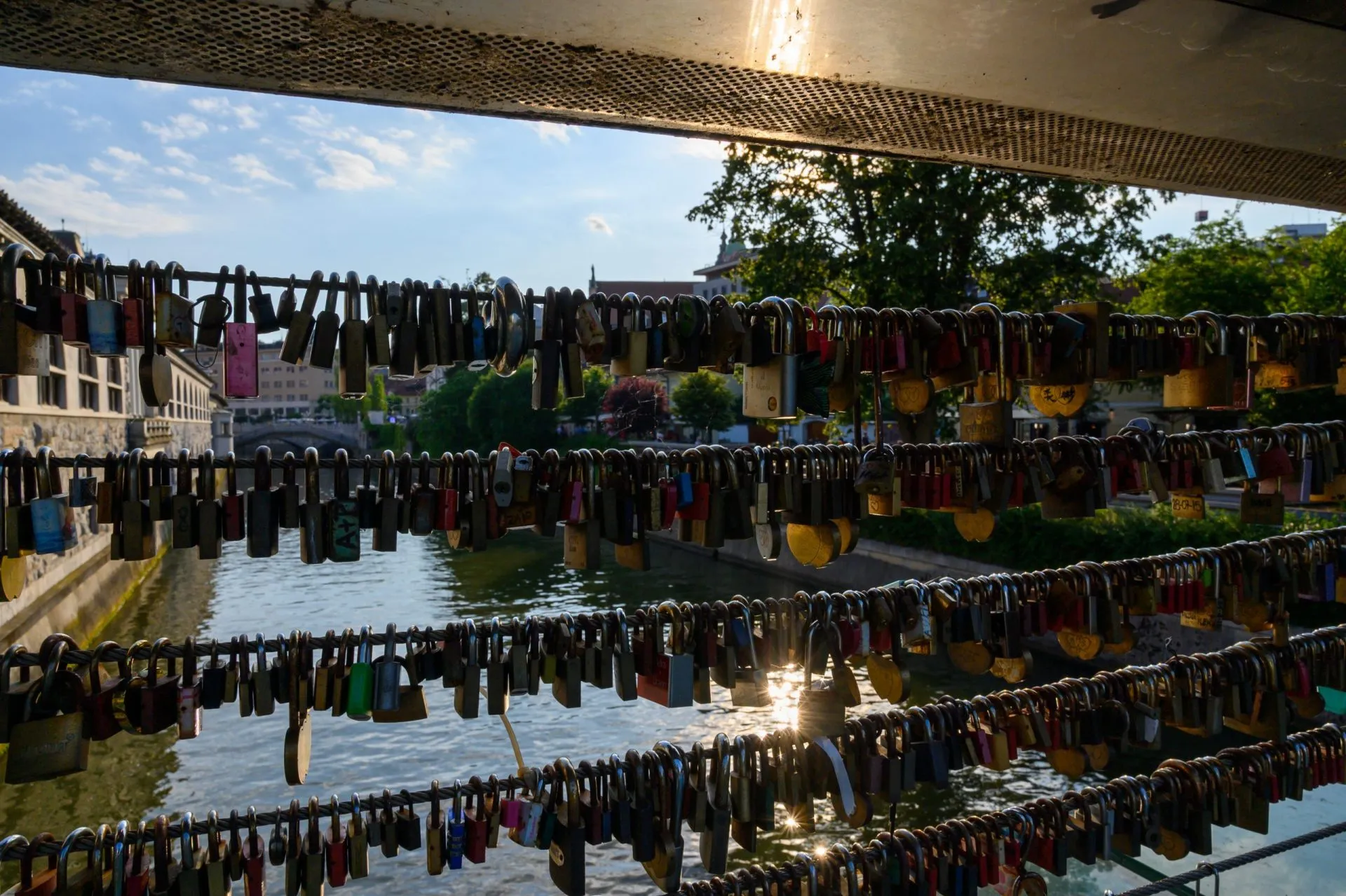 リュブリャナへ戻って観光。どこにでもある鍵がたくさん付いている橋。