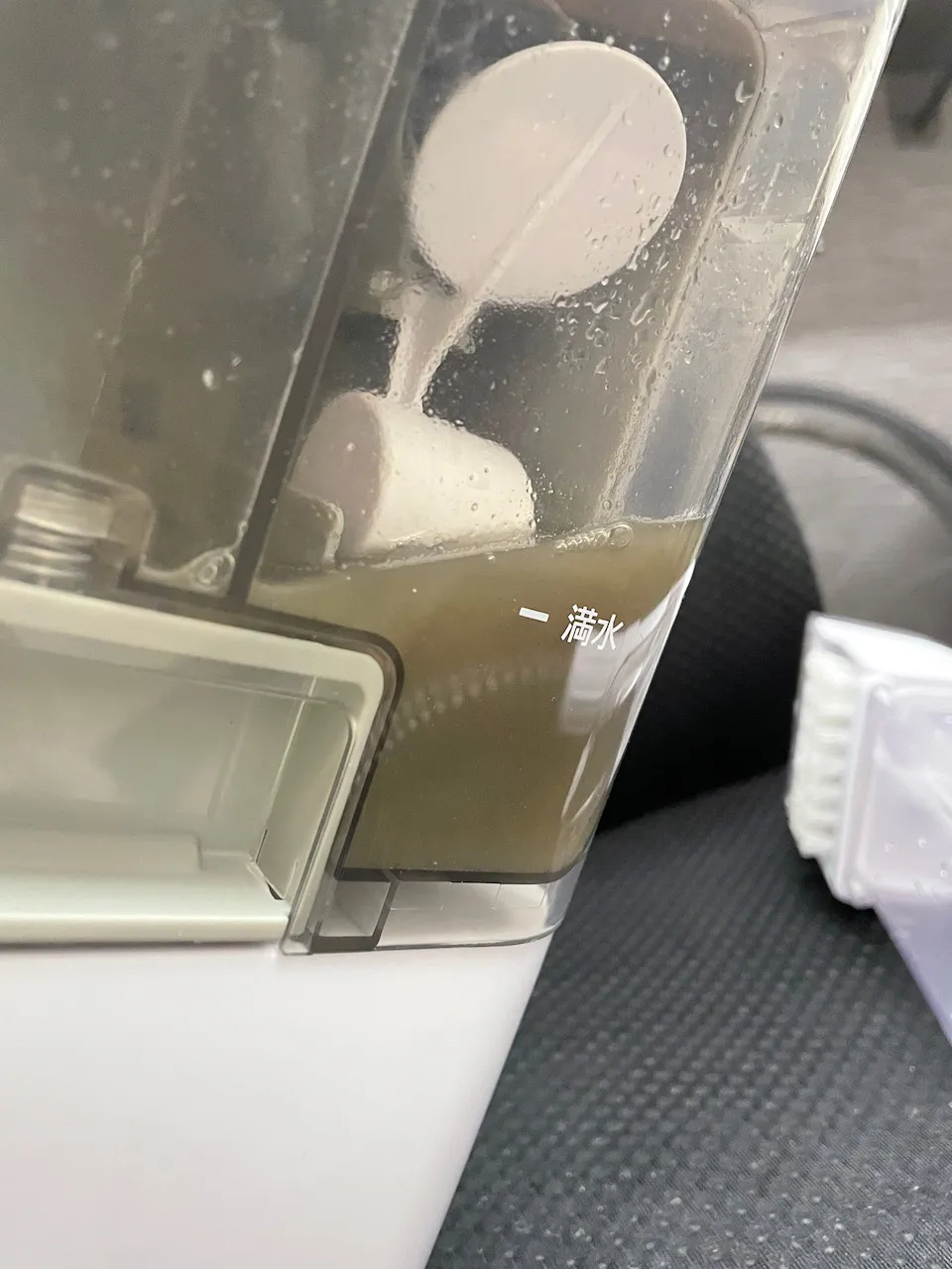 乾かした後に座ると、ファブリック面は触っても嫌な感じがしなくなりました。しかしながら、回収した液体がまだまだ汚いのでもっと汚れが取れると思います。