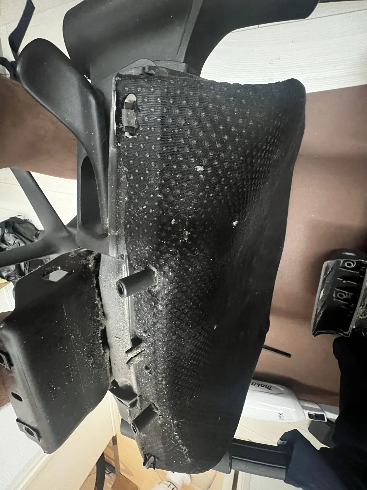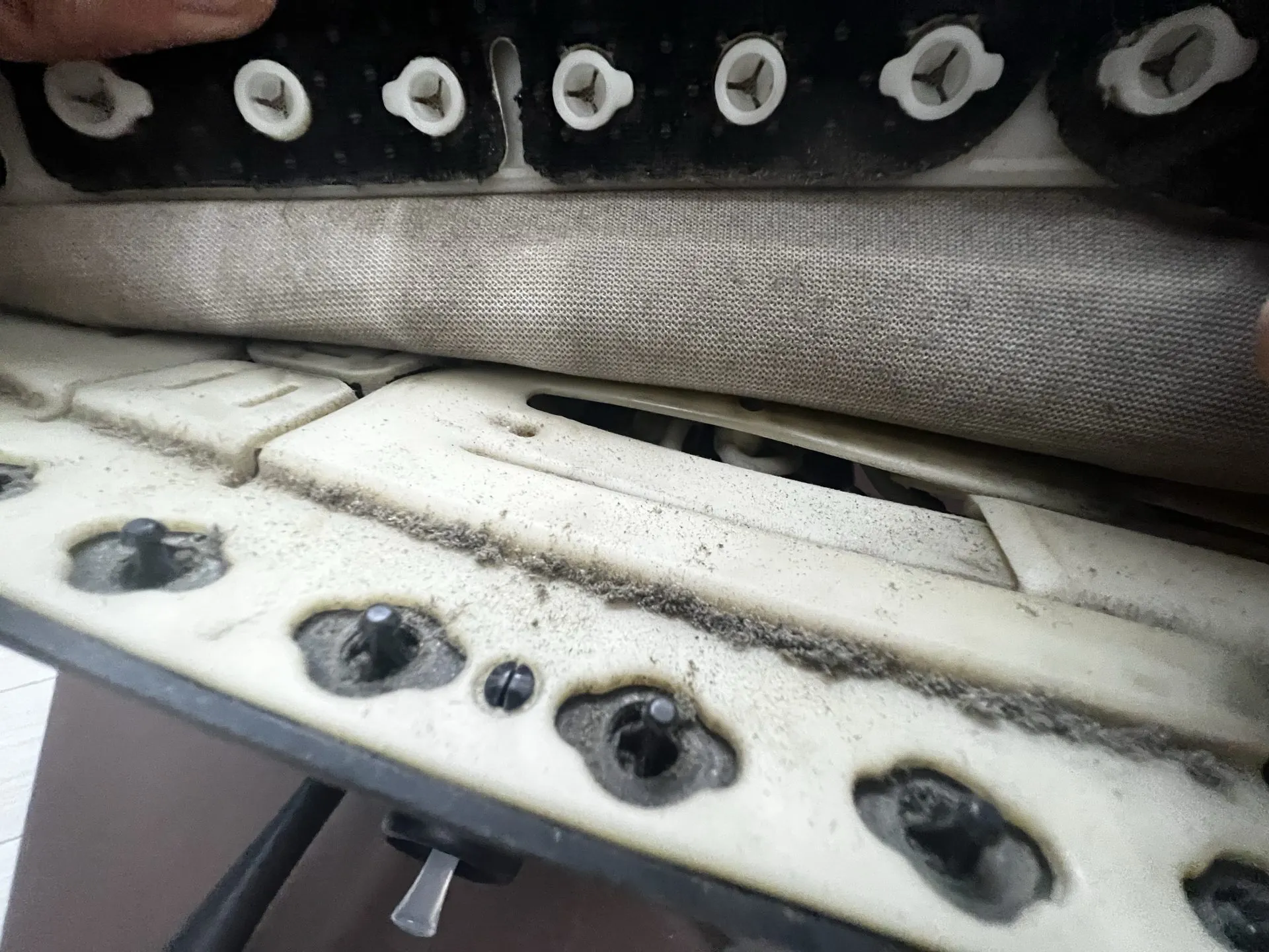 座面のシートの、裏側にフックで留まっているだけなので、フックを外します。ホコリがドバっと落ちてきました。