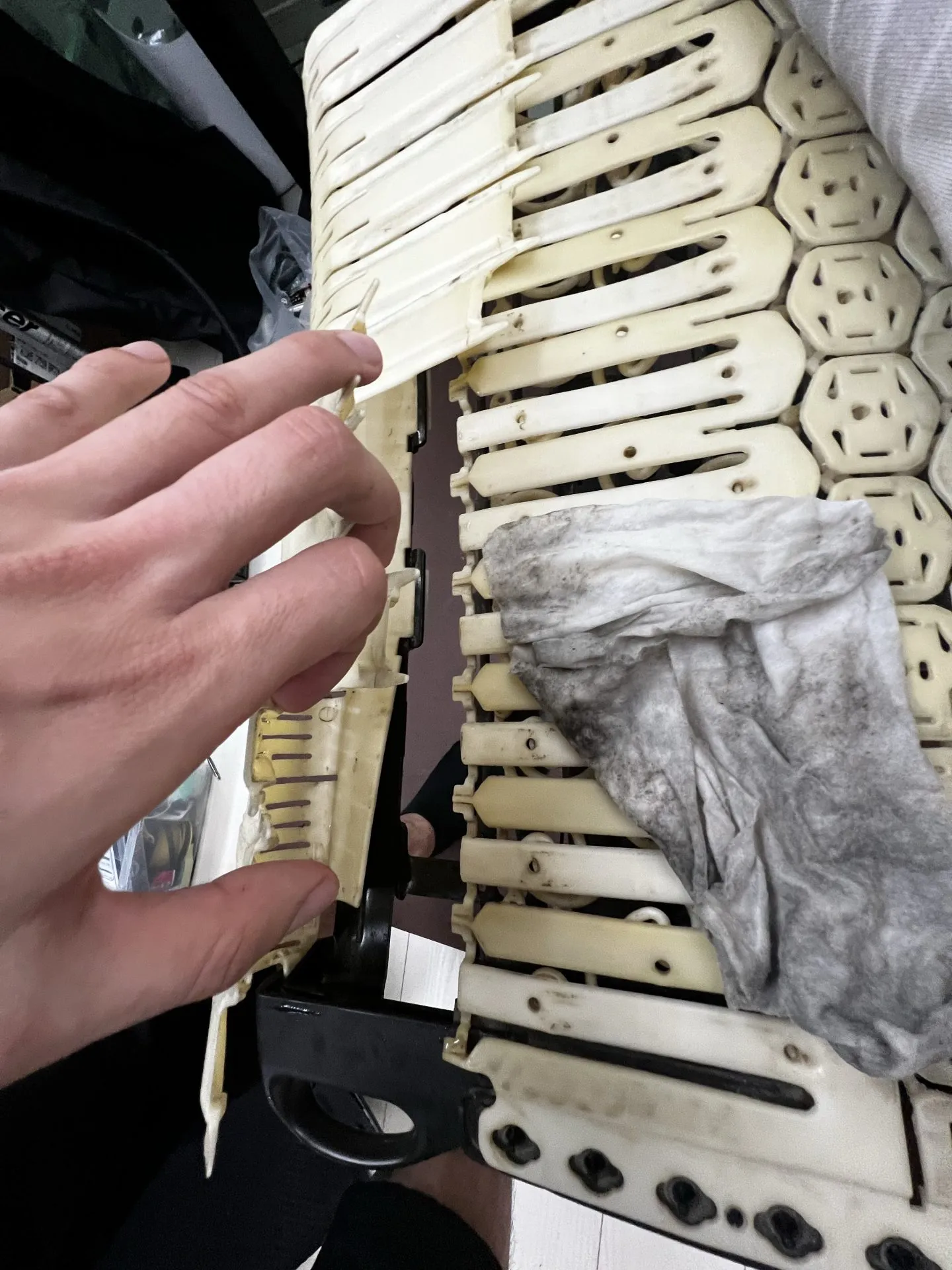 座面の前部分を一番前に引き出して、重なっている部分を外すと少し外れるのでホコリが溜まっているところと樹脂の重なっている部分を掃除できます。