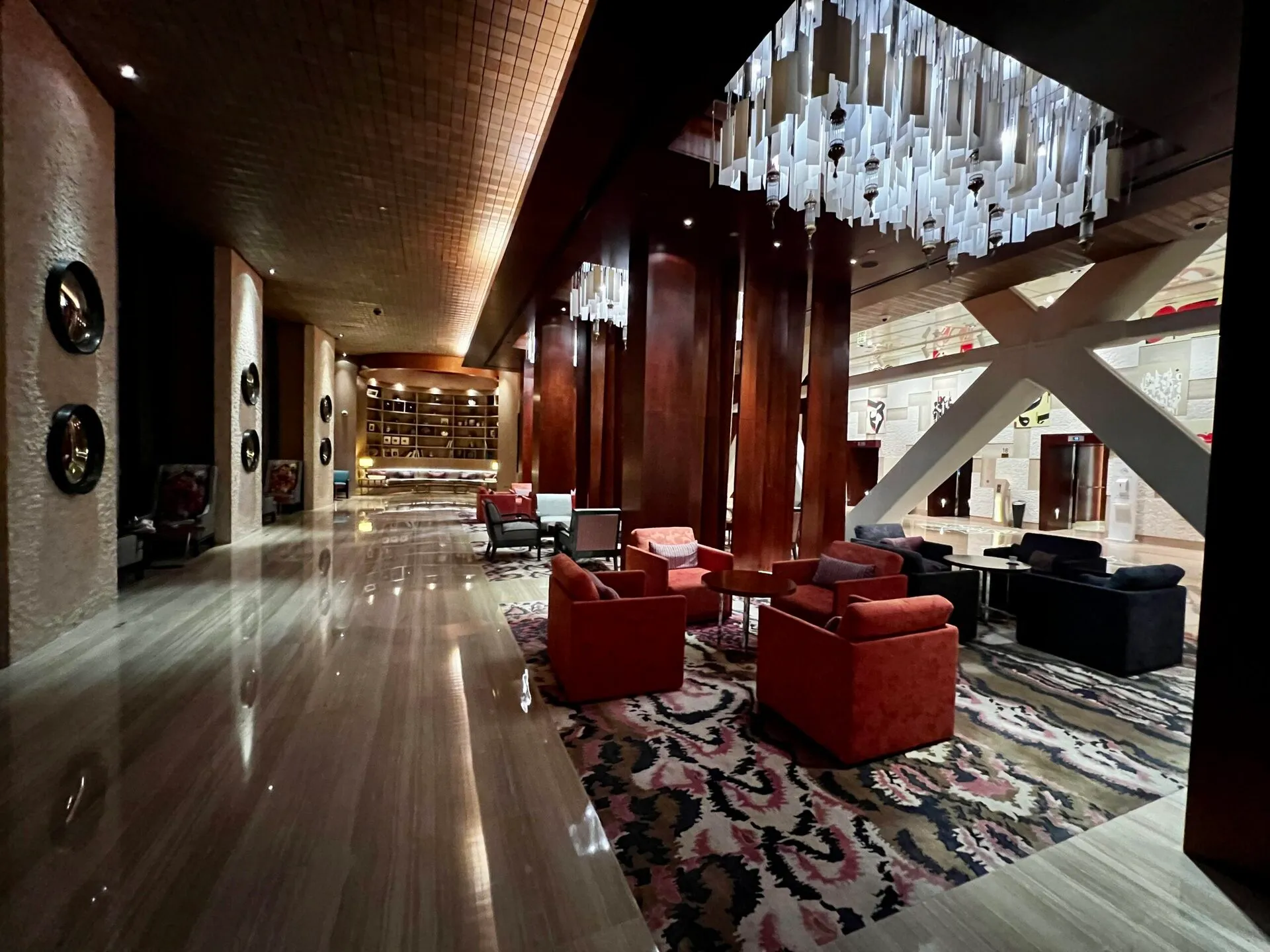 駐車場からホテルへ向かい、エントランスから一歩足を踏み入れると、そこはまさに「宮殿」。天井まで続く巨大な吹き抜け、金と大理石で彩られた内装は、豪華絢爛という言葉がふさわしい空間です。