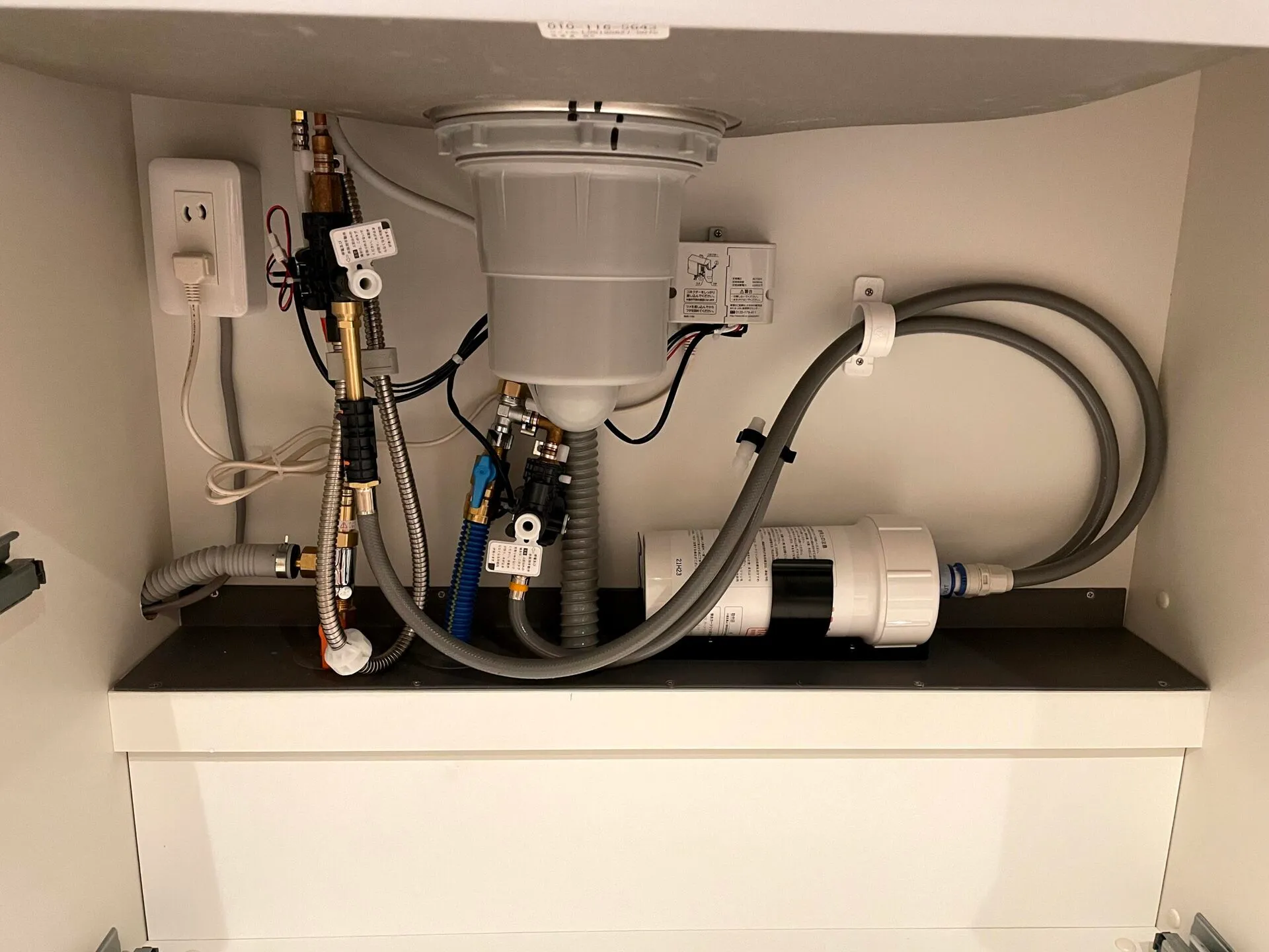 キッチンの下。お湯の官は食洗機へ伸びています。それにしてもアングルが厳しい感じに設置されている。。。